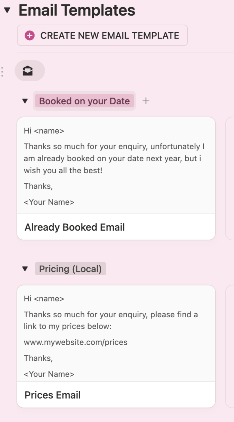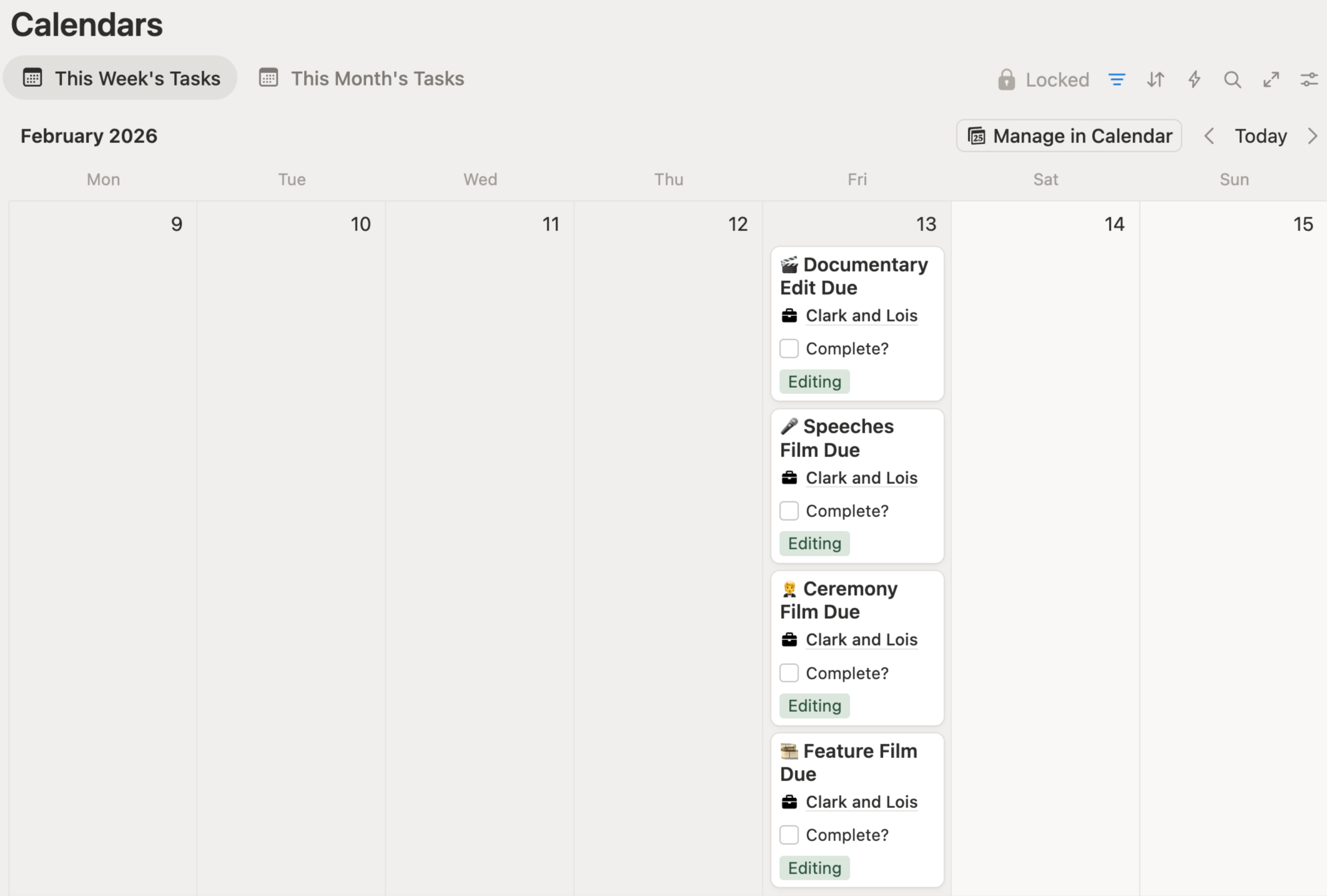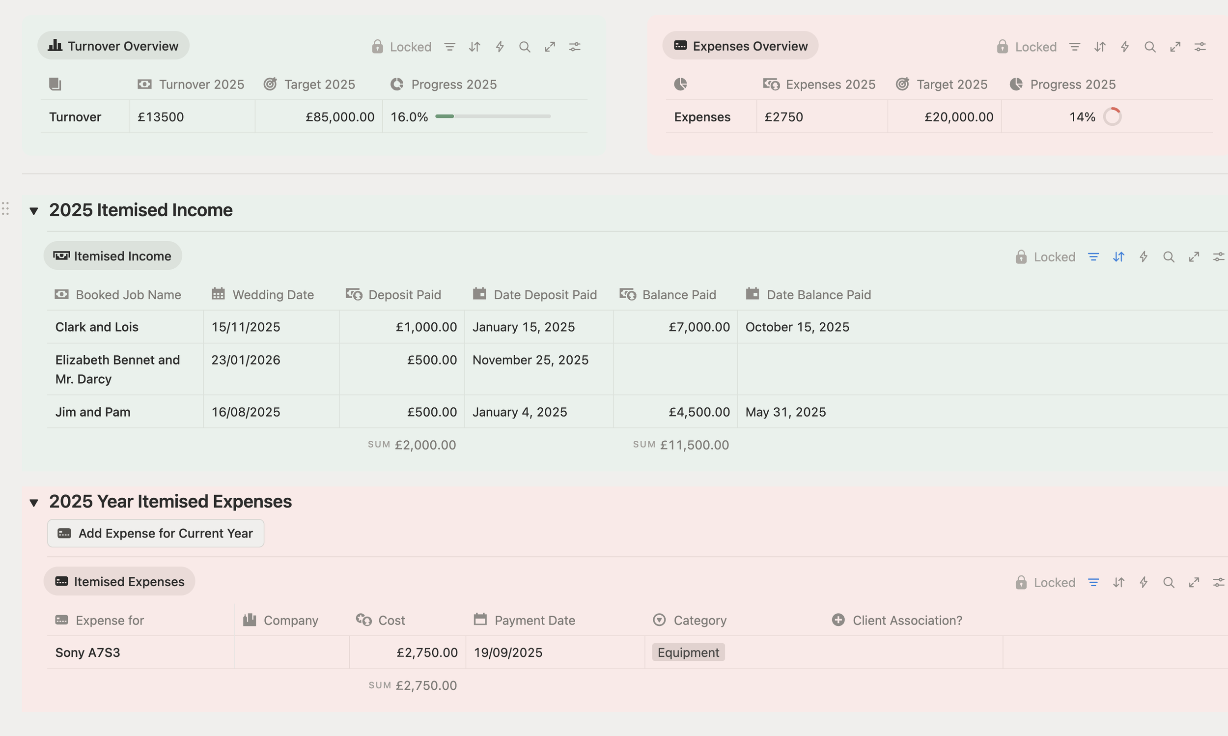 The client’s page is where you will store all the information for an individual booked couple - their contact information, venue details and crucially the date of the wedding. The system I have created will then dynamically add future editing deadlines to your calendar based on the wedding date.
