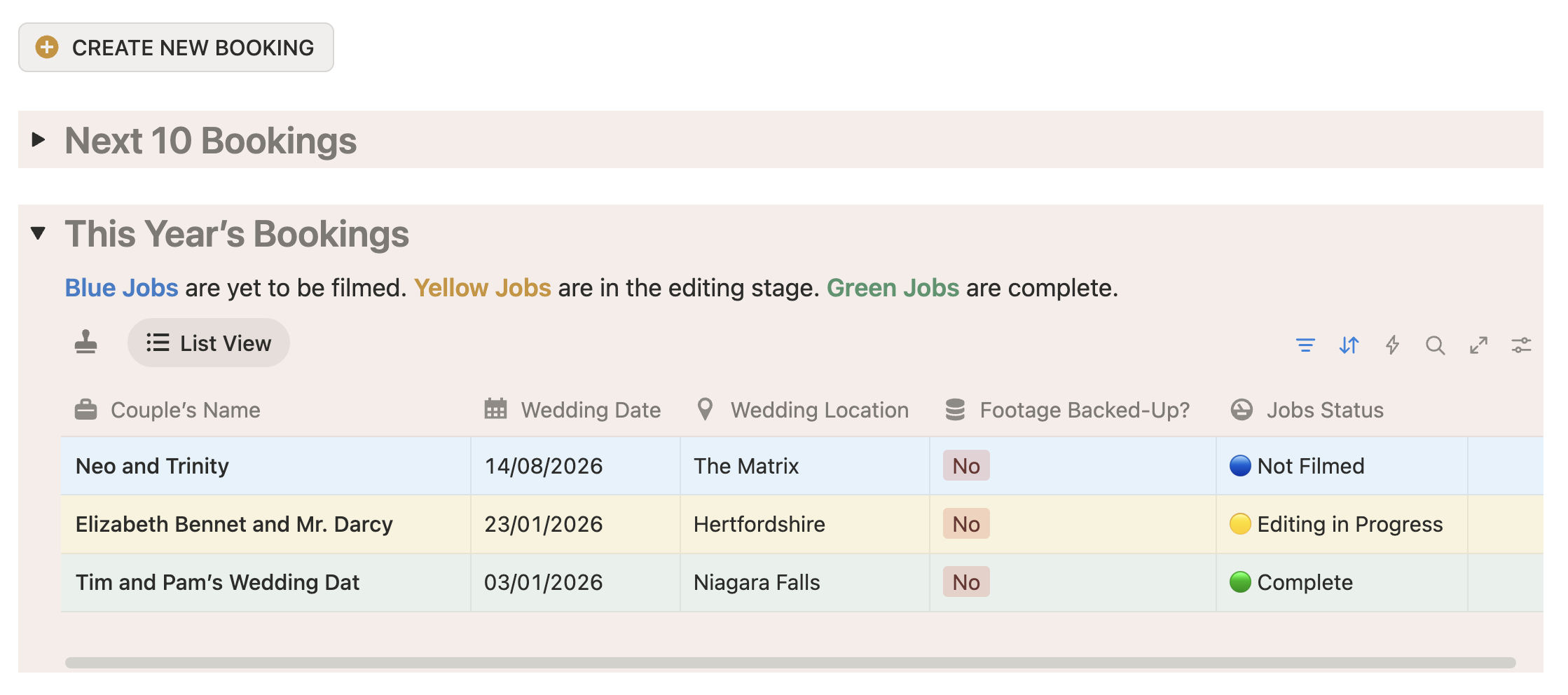 The Wedding Database Page is one of the first databases I created in Notion, allowing me to keep track of what back-ups I have made of my footage and edited films, as well as their location. These entries also connect back to the client’s Booking Page, so you have a reference for whose film is where.
